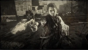 | “ | Dead Eye ist für sich gesehen eine mächtige Waffe, da es im Gefecht vorübergehend die Zeit verlangsamt und es dir so ermöglicht, Gegner mit höherer Präzision zu erledigen. Das neue Dead-Eye-System entwickelt sich im Verlauf des Spiels stufenweise weiter. Zunächst werden automatisch Ziele in deinem Fadenkreuz ausgewählt, später kannst du manuell Treffer auf verschiedenen Zielen platzieren oder nach Belieben in Zeitlupe schießen, und schließlich noch tödlichere Genauigkeit erlangen, indem du die Schwachstellen deiner Gegner erkennst. Das System wächst mit deiner Erfahrung und kann oft den entscheidenden Vorteil in einer Situation ausmachen, in der es um Leben und Tod geht. |