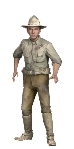 Nick trägt die grundlegende US Army Uniform des Jahres 1911, mit dem leichten Khaki-Hemd, dunkler Hose und den sandfarbenden Leggings.