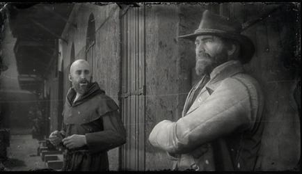 Yendo Arthur Morgan cerca del mercado de Saint Denis se encuentra con un monje pidiendo limosna.