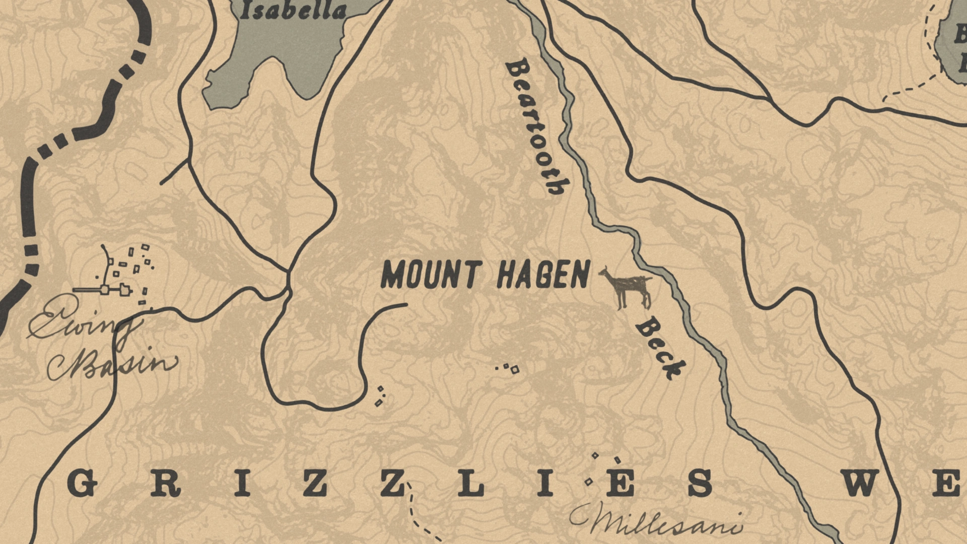 - "Surplombant les Grizzlies enneigées d'Ambarino, le mont Hagen se situe entre le Lake Isabella et Beartooth Beck. Ce placement au cœur des montagnes de l'Ouest en fait un passage privilégié pour se rendre à la Dakota River, plus au sud."