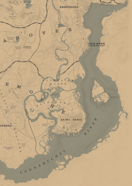 - Есть два способа произношения названия реки. Один из способов — «Ла-на-хас-и», обычно используемый американцами и персонажами с сильным южным акцентом, такими как Артур Морган. Другой способ — «Ла-на-ха-чи», который обычно используется персонажами, которые не говорят по-английски в качестве первого языка, как например, Хавьер Эскуэла.