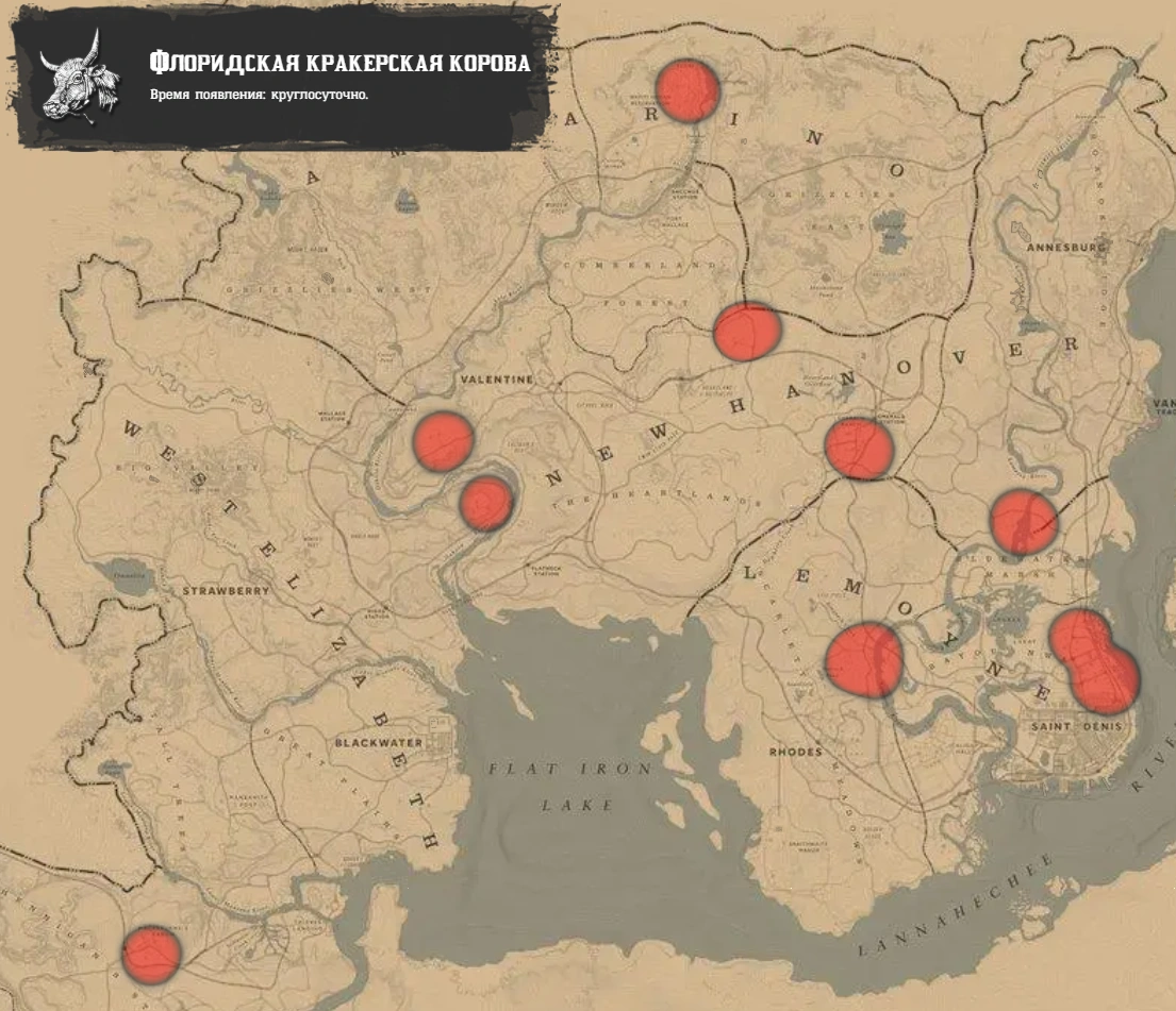 Встречается на большинстве хозяйств во всех штатах. Удобное место для добычи непосредственно шкур — ранчо Эмеральд из-за его удаленности. Коров также можно встретить на полях, как правило их стадо будет охранять хотя бы один вооруженный погонщик.