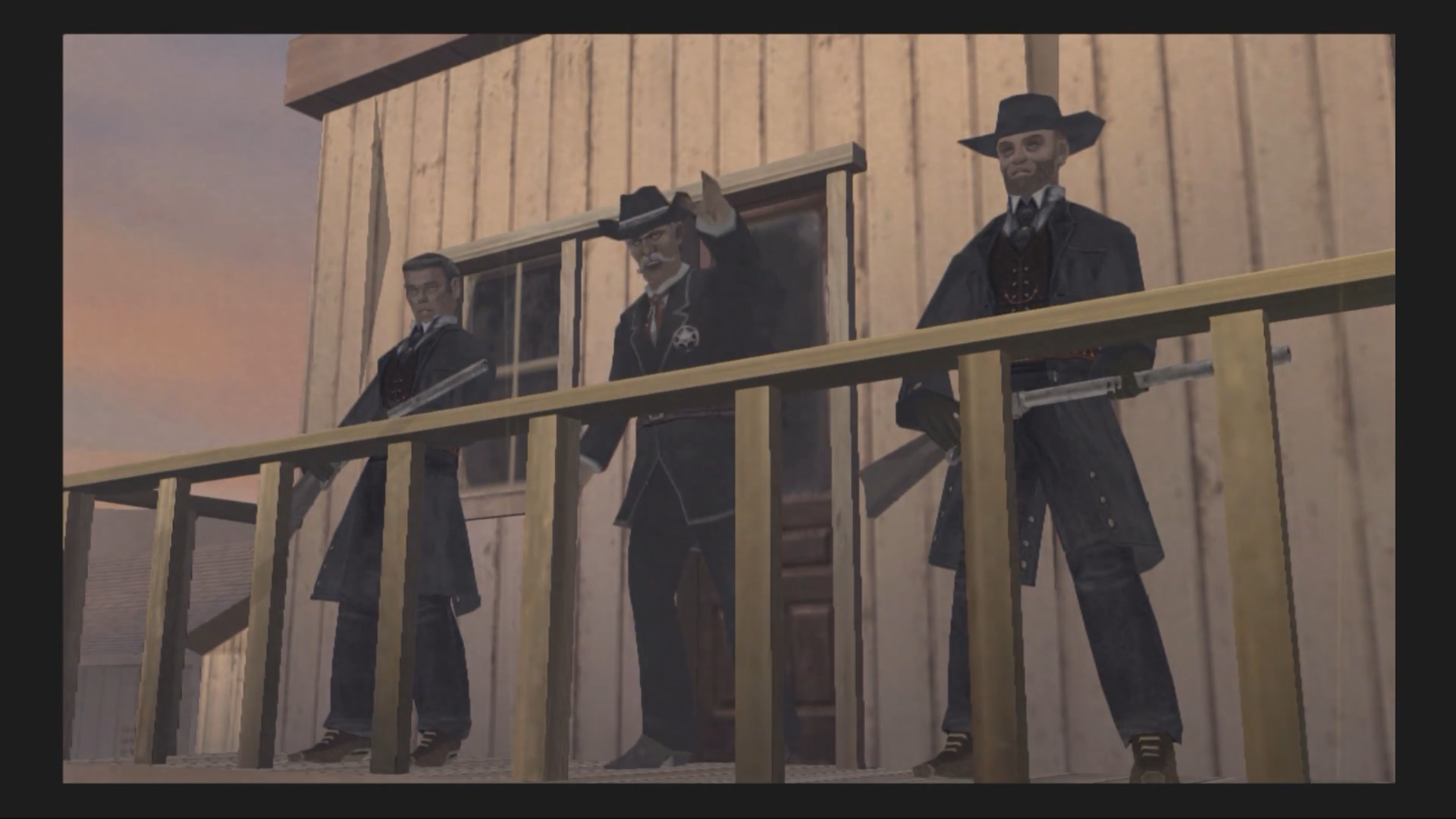 After the weapon selection screen, a cutscene shows the sheriff on a balcony, flanked by Jason and Oswald Cornet, kicking off the Battle Royale. He introduces Gabriel Navarro and Red Harlow as the first contestants.