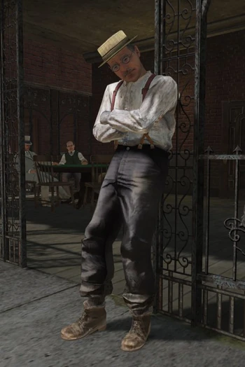 Eager for quick riches, Clay partners with seasoned prospector Floyd Brogles to excavate the old mine at Gaptooth Breach. While using the miners' old railway house to haul equipment, they are ambushed by local vagabonds, and Floyd is captured and hogtied. Clay manages to escape but gets injured and finds himself unable to abandon Floyd. He wears a straw boater hat, spectacles, and fine clothes, suggesting that he is fairly well-to-do.