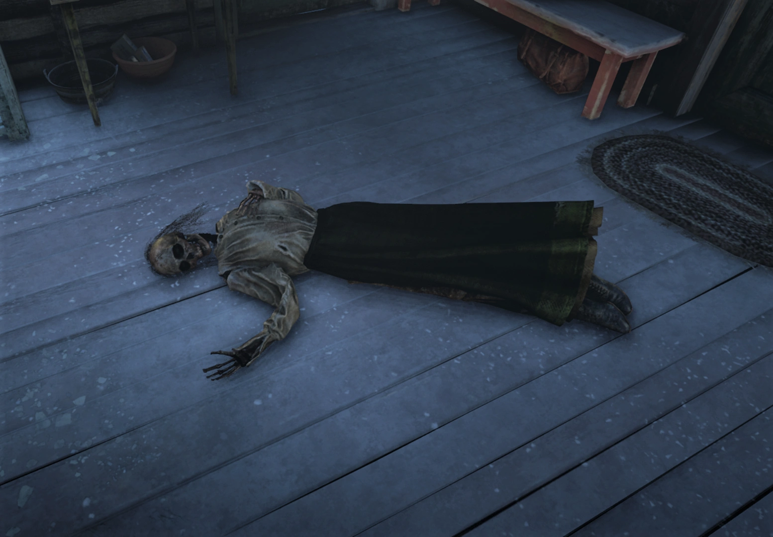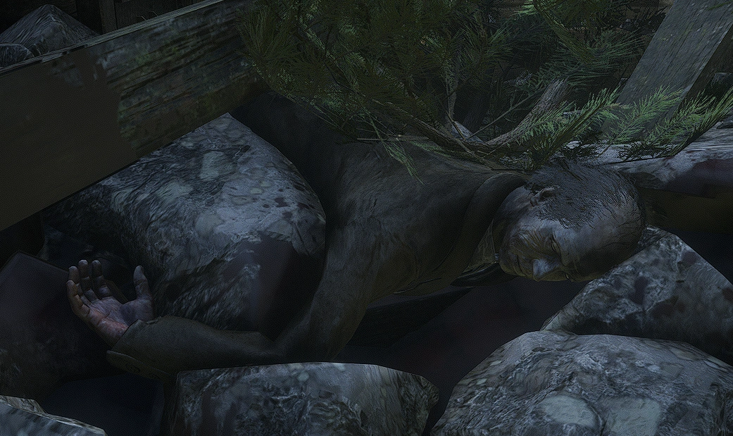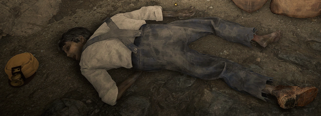 | Dead Miner | In Beryl's dream, it is possible to detonate the dynamite plunger inside the mine and clear away rubble from a cave in that happened previously. Inside, there is a single miner with a Wide-Blade knife in his back next to his miner's helmet that the player can take, and a gold nugget. | Beryl's Dream | Give that the man has a knife in his back and there are no other corpses in the mine, it's likely the cave in was deliberately done in order to hide the murder of the miner. | |