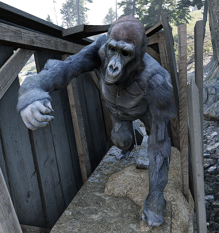 | Stuffed Gorilla | This gorilla was likely stuffed by Miss Hobbs, but fell off during transit and was left behind. | North of the Taxidermist House | It's possible to shoot the head and limbs off. In the beta, the gorilla had textured eyes though in the final game they are simply blacked out. It's possible the model was originally intended for a living gorilla based off the texture names and some of the textures lacking seams. | |