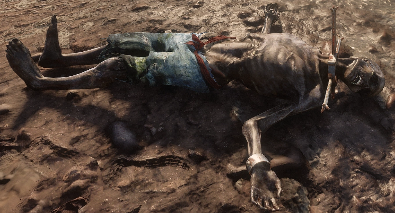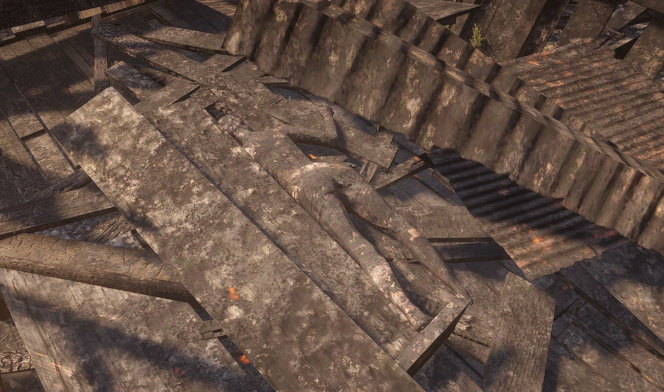 | Limpany Corpses | There are three corpses in Limpany. Two are prisoners who were likely left behind after the fire, and the third is located next to an outhouse but the corpse doesn't look charred so his cause of death is unknown. | Limpany | The prisoners may be a reference to Mr. Black and Mr. White, given they are both prisoners and have the same hair models. Though, this could just as well be a coincidence. | |