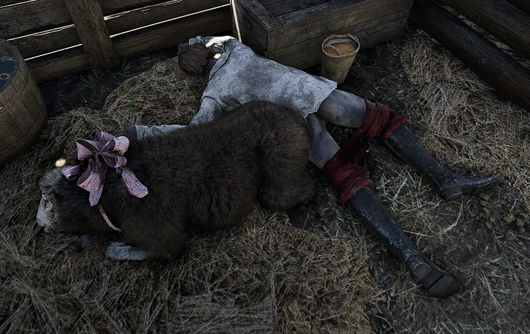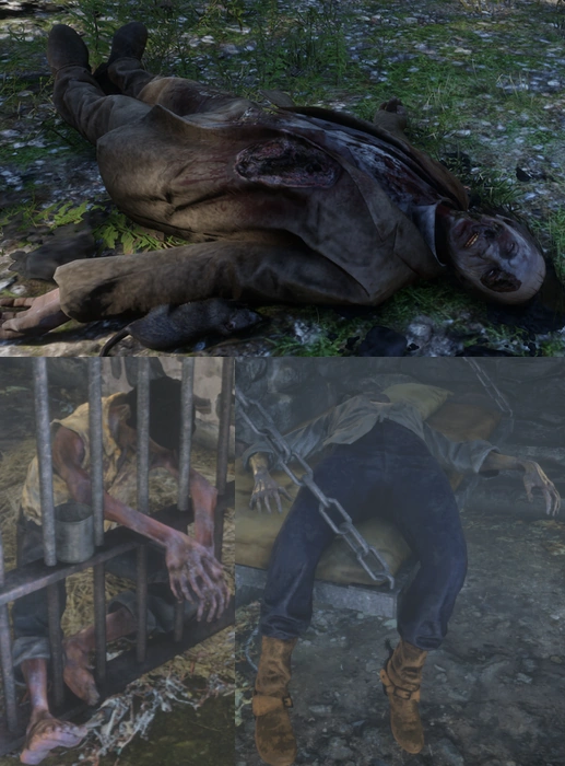 | Dead Man and Sheep | In one of the sheds at Guthrie Farm, a dead man with his pants down and a black sheep wearing a bow can be found dead on the floor. Given that the workers do not react to the bodies, it is likely they were killed for engaging in bestiality. | Guthrie Farm | The man's history and origins are unknown. The sheep has a gold wedding ring that can be looted, and another living black sheep with a tattered bow can be found nearby. | |