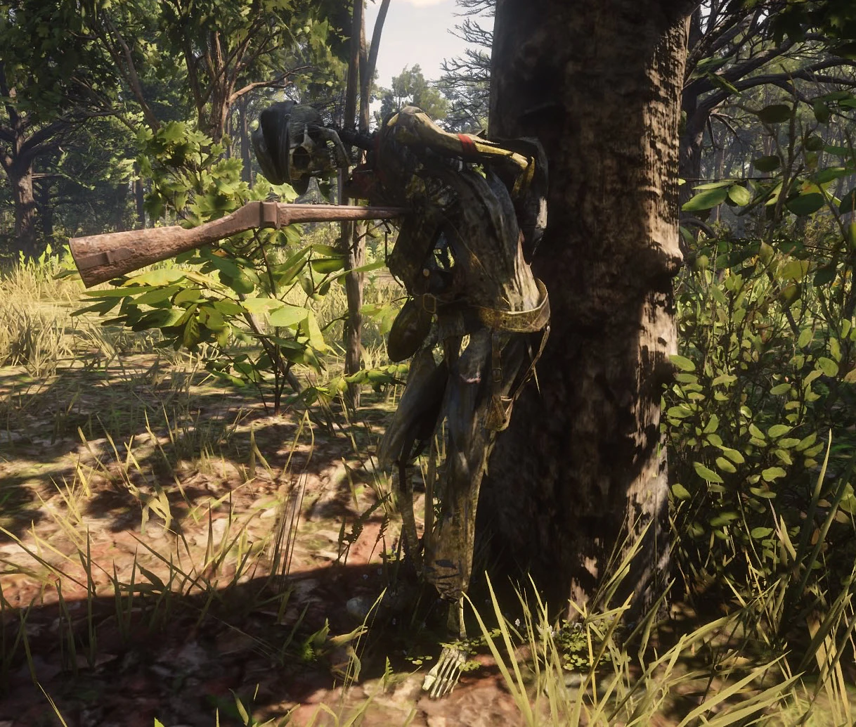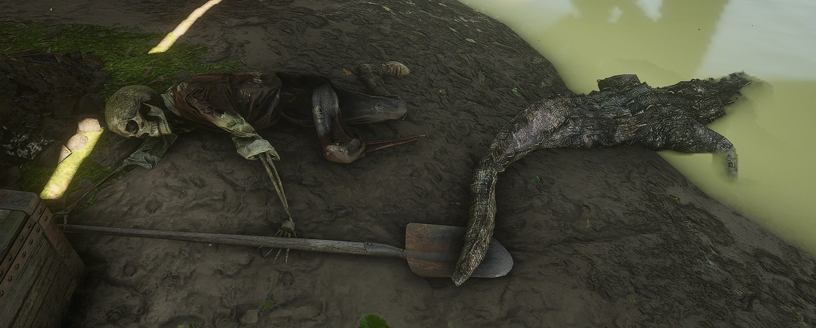 | Pirate Burying Treasure with Gator | Underneath a bridge, there is a skeleton with a shovel next to a treasure chest, and a gator that appears to have died after killing the man. The chest is relatively empty, only containing a few gold coins. | Bridge underneath the "B" in Bluewater Marsh | The corpse model is an edited version of an unused Guarma corpse, possibly implying some relation between the two. | |