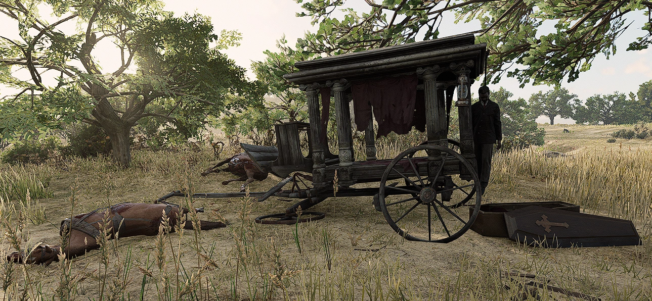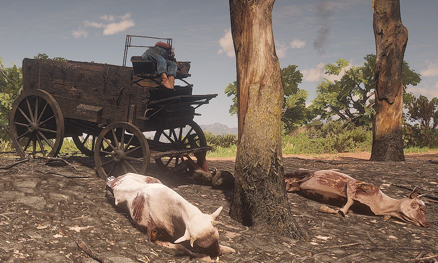 | Lightning Victims | It appears a bolt of lightning struck the wagon of some settlers, causing the cows to crash into a tree and burning the surrounding area. The corpses will begin to decay over time. | Near Rio Del Lobo Rock | This is the only instance of any creature besides horses being shown to pull wagons in the game. | |