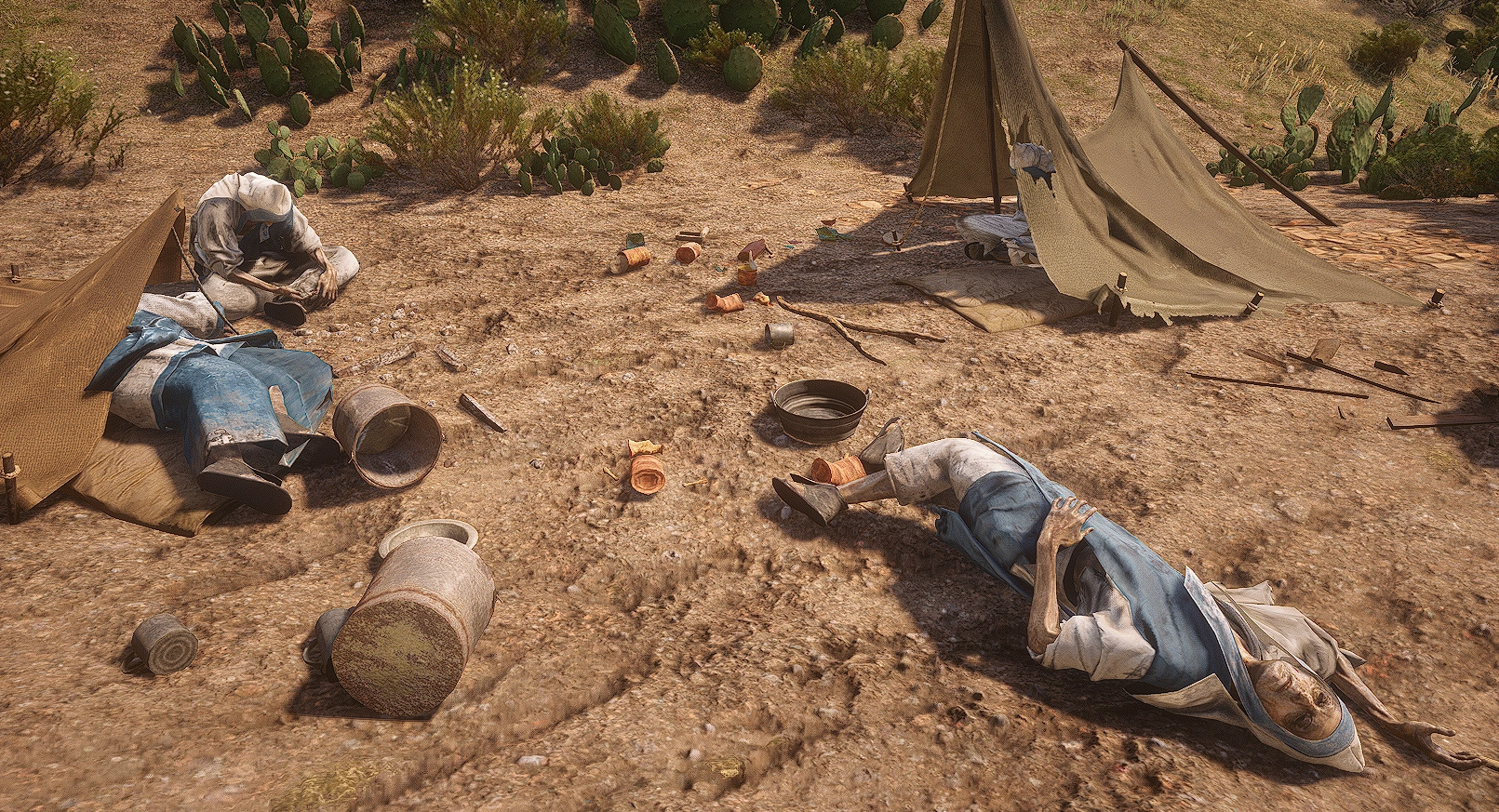 | Water Diviners | Water Diviners (also known as dowsers) are people who believe they can use an apparatus to locate water, ores, or other things buried under the ground. These diviners appear to have taken their role very seriously, wearing religious robes and blue sashes though all of them died of unknown causes. One of the men has a small jewelry bag that can be looted. | Directly above the "o" in Cholla Springs | The dowser's location is near Pleasance House, which is the location of the Red Dead Redemption mission "Water and Honesty" which features a dowser interested in purchasing the land there. This is likely a reference to that mission. | |