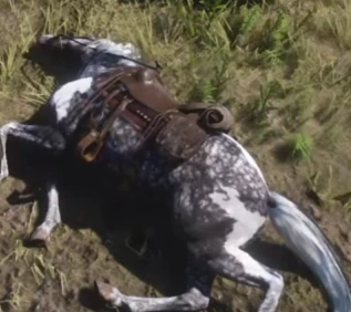 John's Bay Mare | Just before the start of the game, she and John were out on a scouting mission following the Blackwater Massacre, but they were attacked by wolves and she did not make it. During "Enter, Pursued by a Memory", Arthur and Javier come across her remains and Javier remarks that John had at least been riding her since Blackwater. | On a snowy mountain in "Enter, Pursued by a Memory". | While her breed is unknown, the markings she uses are actually identical to the Cleveland Bay. Her model and textures are reused for the panoramic map horse and avalanche horses, and there exists an unused dead horse model resembling her which was cut from the game. Also cut from the game was a Silver Bay Thoroughbred wearing the same saddle that can be spawned in using cheats. The most likely reason for their exclusion from the game is that static models are less likely to cause bugs. |