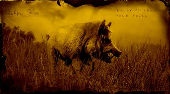 Travelers have spotted this boar around Stillwater Creek. It sports a dark, rusty coat and has a distinctive white face. If approaching, stay hidden and be prepared. Boars have a tendency to charge.[1]
