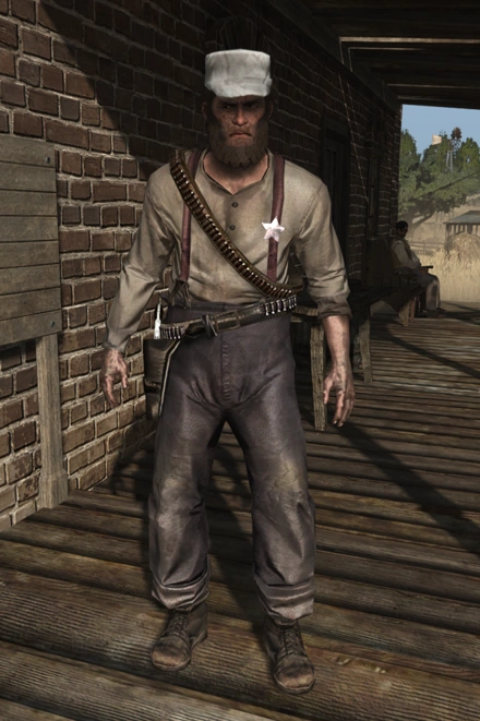 Monroe is a lawman who operates in West Elizabeth and Hennigan's Stead, New Austin. He wears a white shirt with a bandolier across his torso.