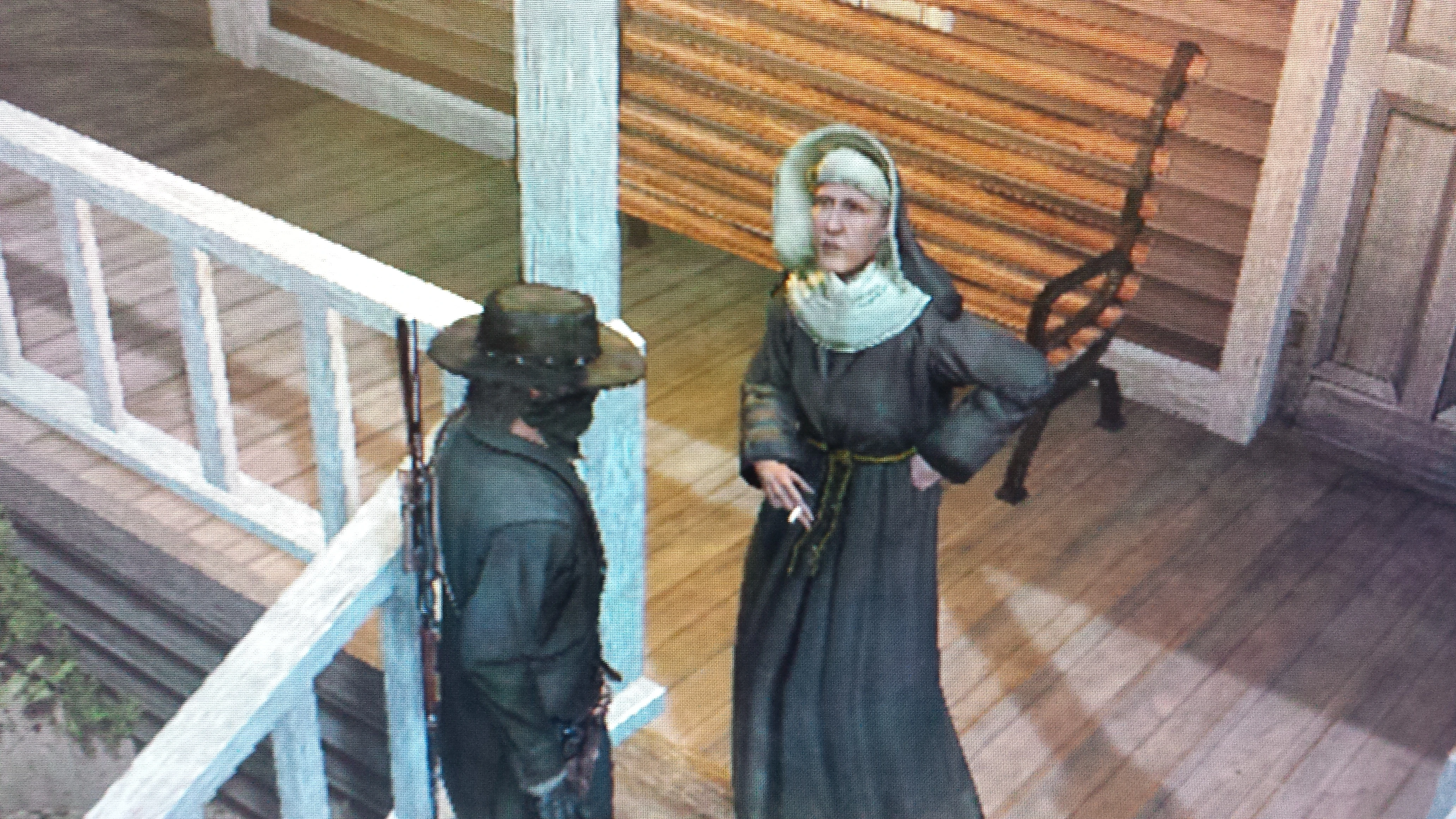 - Update - I met with the nun again (4th encounter) this time I had just rode back into Blackwater after killing over ten policemen just outside of town while wearing the bandana. For this encounter she appeared directly in front of me and this time she gave me money. Then she walked over to a nearby house and started smoking a cigarette on the porch! A good way to find the nun is as soon as you enter a town stand still and don't move, just pick a spot anywhere. Probably a good method is to go into the town between 7 a.m. and 10:00 p.m. and stand where they post the wanted poster, if she does not appear by the time the bounty is posted, try again. Doesn't matter if you're on foot or on your horse. All my encounters began after I maxed out my honor. I suggest wearing the bandana so that once you max out your honor it doesn't go down this way it will highly increase your chances of finding a nun, although usually, she finds you. Goose.gander.948 (talk) 14:54, May 5, 2014 (UTC)