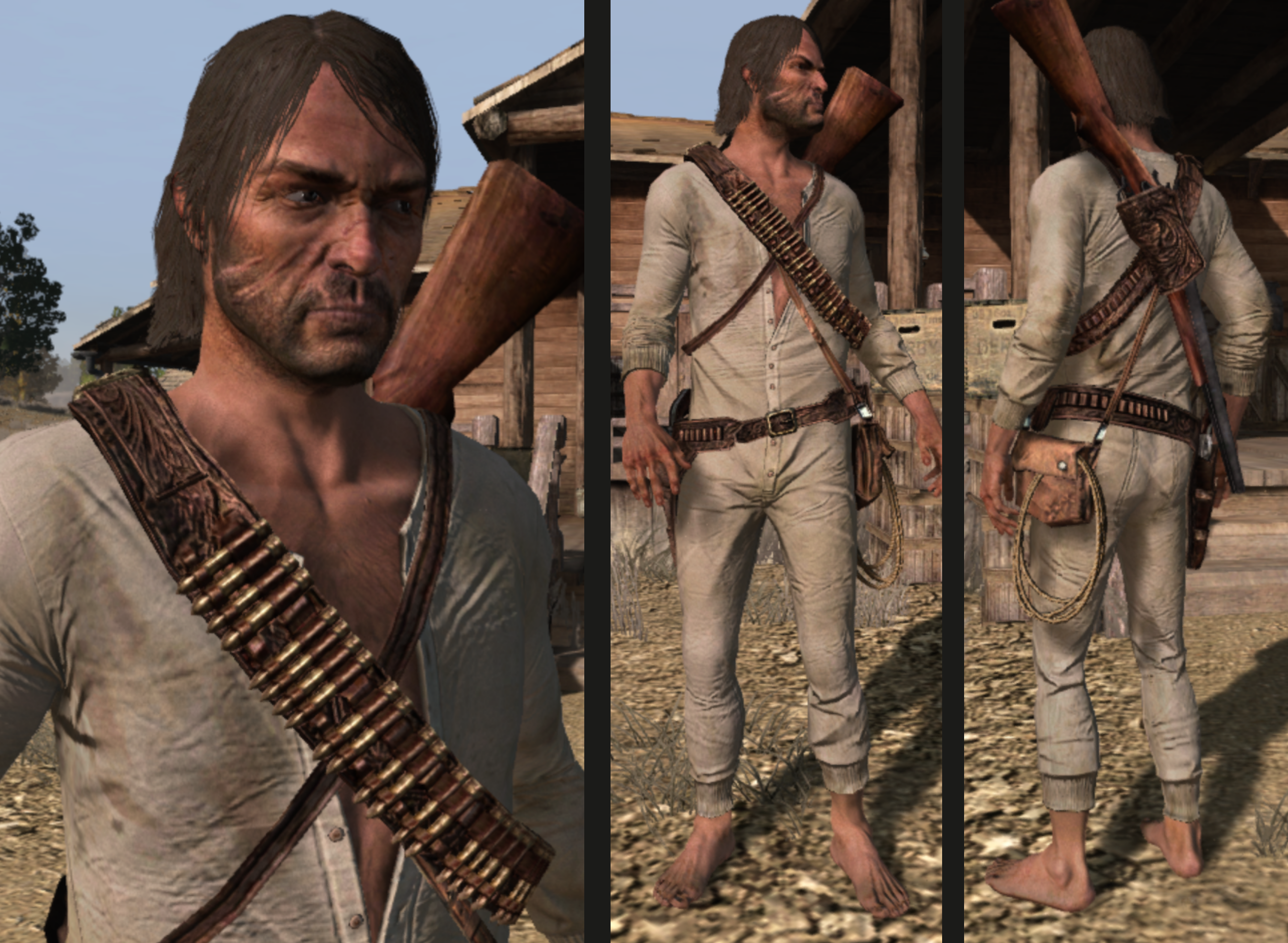 The Union Suit is essentially John Marston's pajamas, and includes a flannel, cream-colored one-piece pajama with a button-up front and a button-up back-flap. It also makes Marston barefoot as well as removes his hat.